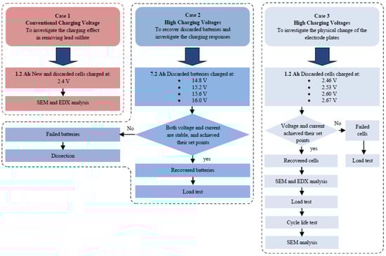 There were three cases in this experiment. The first case mainly involved the restoration of discarded lead acid cells using a conventional charging voltage of 2.4 V and their comparison with an identical new cell, aiming at investigating the charging effect of the conventional charging voltage in removing the accumulated lead sulfate from the cells. The second case involved restoring the discarded batteries using the proposed high charging voltages (greater than 2.4 V) in order to study the charging capability and charging response of the battery. The third case involved determining the most appropriate charging voltage for restoring retired batteries through the verification of the physical changes in the plate surfaces. Figure 1 shows a flow chart for the three cases.