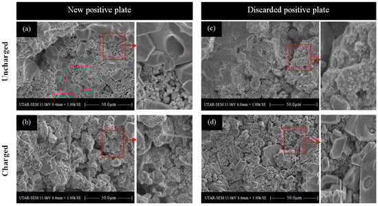Figure 3 shows microscopic scans of the new and discarded positive cell plates before and after charging. Figure 3a shows a new plate surface before charging. It can be seen that the granular structure of the active material is crowded together, exhibiting a low-porosity character. Figure 3b shows the surface of the charged plate. It can be seen that the highly uneven surface of the plate was recovered after charging, increasing the porosity of the surfaces and facilitating the permeation of electrolytes into the inner part of the plate. Unlike the new plate, the uncharged discarded plate presented in Figure 3c showed a granular structure for the active material. Due to the long cycling history, the micropores of the plate were occupied by lead sulfate, which reduced the plate porosity. Figure 3d shows the charged discarded positive plate. The granular structure of the active material can be seen. However, the surface porosity was not as high as that of the charged new positive plate. Thus, charging a cell at a conventional charging voltage cannot recover the surface porosity of the positive plate.