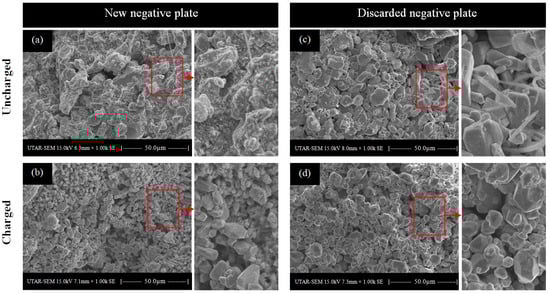 Figure 4 shows the microscopic scans of the new and discarded negative plates before and after charging. Figure 4a shows the uncharged new negative plate with a low-porosity surface. However, this surface structure was changed after it was charged, as shown in Figure 4b, and the plate surface returned to being highly even. Figure 4c shows the uncharged discarded negative plate. The granular structure of the active material appeared to be dense. Compared to the charged plate shown in Figure 4d, there was no noticeable physical change. In other words, the plate did not provide porosity even after it was charged. As shown by the surface morphology study, the conventional charging voltage could not restore the surface porosity of discarded negative plates.