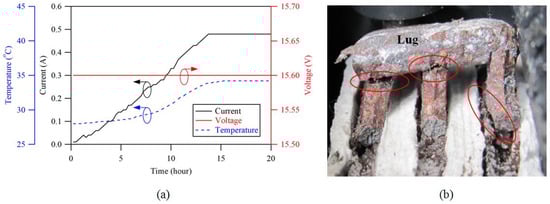 Scenario two: (a) charging profile of the open-circuited batteries when charging at 15.6 V; (b) broken connections between lug and plates.
