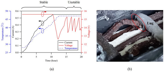 In scenario 3, the batteries were charged at 15.6 V and 16.0 V. The batteries in this scenario could return to a different charging profile where the voltage-on-charge fluctuated during the charging. Figure 7a shows one of the sample batteries that were charged at 15.6 V. Driven by the high charging voltage, the current successfully reached the set value of 0.077 C (0.55 A). However, voltage fluctuation occurred in the second half of the constant-current stage. This was the stage at which the SOC and the battery voltage increased. During the voltage fluctuation, the battery temperature rose to 47 °C, which was 2 °C higher than the optimal operating range [40]. As can be seen in the anatomical image shown in Figure 7b, the deformed positive grids were in contact with the sulfated negative lug, which caused a partial short circuit in the respective cell. When forced by a higher voltage, the charging current intermittently flowed through the contact point and partially bypassed the cell, which caused the terminal voltage to drop. As the voltage dropped below the potential that could overcome the contact resistance, the current reverted to the original value. As a result, the cell operated as normal, and the SOC and battery voltage rose again. This phenomenon kept repeating, resulting in voltage fluctuations. Thus, this category of batteries with an internal short circuit was irrecoverable, and they should be discarded.