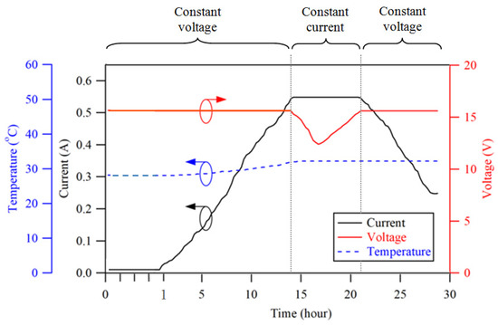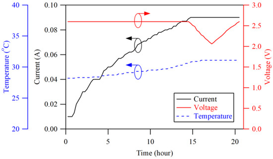 Figure 10 shows the charging response of one of the recovered cells charged at 2.6 V. In the first 14.5 h, the acceptance of charge gradually increased, indicating that the applied voltage level improved the ionization activity in the sulfated cells. Since the cell had no physical defects, the rise in cell temperature was solely caused by the charge transfer during the ionization process [40]. Therefore, the maximum temperature recorded was 31.1 °C.