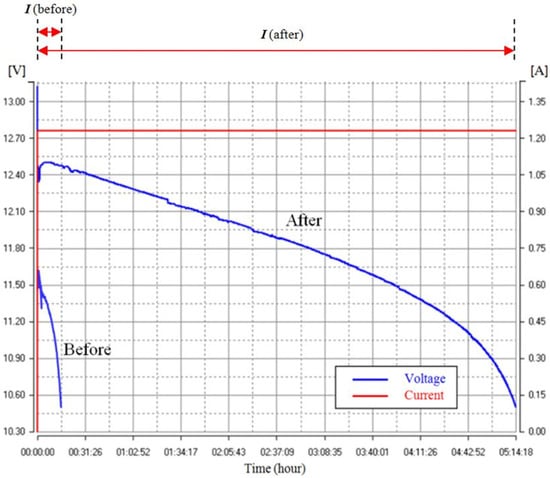 Figure 9 shows the discharge curves of the recovered battery before and after the restoration. The comparison shows that the discharge capacity of the recovered battery was apparently high after the charging process. Note that a 5 h discharge rate was applied for the load test, and the cutoff voltage was set at 10.5 V. The steep “droop” in voltage at the beginning of the discharging process was caused by the sudden engagement of a heavy load. The rebound reaction indicated that the ionization between the cell plates and the electrolyte was active and robust [41].