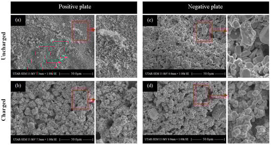 Figure 11 shows the surface morphologies of the positive and negative plates before and after charging. Figure 11a shows the surface of the uncharged positive plate that lost porosity due to sulfation. This surface morphology provided a limited surface area for electrochemical reactions. As a result, the cell’s charging capability and ability to store energy became very limited. Figure 11b shows the re-emerged rough surface on the fully charged positive plate. Details on the plate surfaces can be seen in the magnified SEM image, which shows the micropores present on the surface. Figure 11c shows the uncharged negative plate. There were no micropores apparent on the surface. Nevertheless, the plate surface returned to a high degree of roughness after being charged at a higher voltage, as shown in Figure 11d.