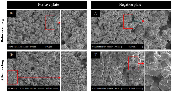 A microscopic scan of the plate surfaces was performed to investigate the physical changes in the cell plates after the cycle life test in order to compare them with their initial state. Figure 13a shows the initial surface morphology of the positive plate. The micropores on the active material can clearly be seen. After the cycle life test, the surface was smoother than the initial condition, indicating a reduction in surface porosity. The highlighted areas shown in Figure 13b indicate a reduction in the surface porosity, as the surface was smoother than the initial state. A similar phenomenon was also observed for the negative plate. Figure 13c shows a negative plate before the cycle life test. However, Figure 13d shows that the granular structure of the active material appeared to be dense after the cycle life test, which decreased the surface porosity.