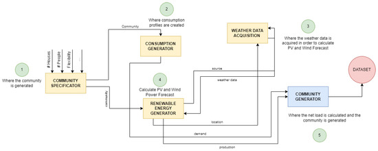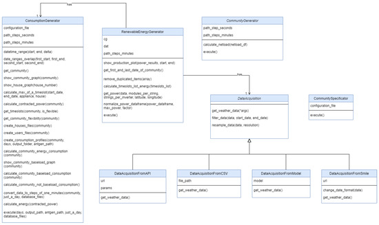 The way that the simulator was implemented is presented in Figure 1, where it is possible to see the five different modules of the simulator. Additionally, the Unified Modeling Language (UML) diagram, showing the different classes implemented in the simulator and the different components that are being simulated, is presented in Figure 2. PROCSIM currently focuses on the simulation of residential consumption and RES from PV and wind. However, in the future, the goal is also to simulate the grid (import and export from the grid), batteries, and electric vehicles. Each module is briefly described next.
