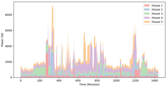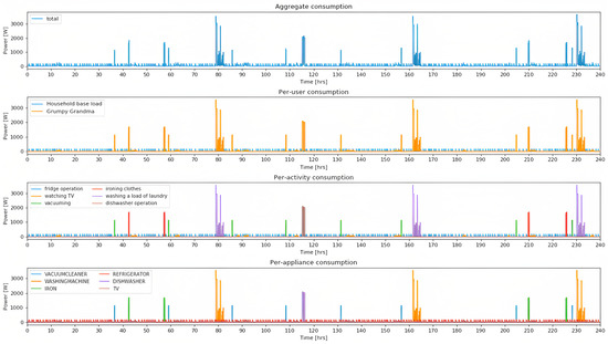 In Buneeva et al. [12], the authors proposed AMBAL, a system that generates models from real devices’ power consumption data collected by smart plugs. To test the quality of the traces synthesized from AMBAL’s models, they developed ANTgen [25], a synthetic appliance trace generator that combines device models into aggregate traces and uses them to evaluate disaggregation algorithms. SMACH [13,26] is a meta-model and multi-agent simulator of human activity that allows the modeling and simulation of household activities and their relations with electricity consumption. Finally, the LoadProfileGenerator [14] is another household consumption simulator. This simulator enables the generation of load profiles for electricity, gas, hot water, and cold water and returns individual load profiles.