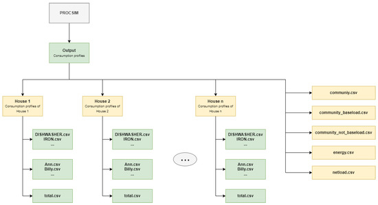 The generated EC datasets are organized as represented in Figure 4. The data are stored in the output folder. It contains a folder for each community house with its consumption profiles: aggregate, per appliance, per user, and activity. Furthermore, it contains the following profiles: community (i.e., the total consumption of the community), community_baseload (total base load of the community), community_not_baseload (total consumption of the community minus the total base load), renewable energy (community production), and finally the net-load (demand minus the production, which corresponds to the demand that must be met by the grid).