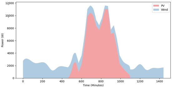 After generating the demand, this second step uses the Renewable Energy Generator module to generate PV and wind production (as shown in Figure 6). In order to generate realistic profiles, weather data were acquired from two different sources: from Solcast API when considering PV production with a resolution of 30 min, and Tomorrow.io API when considering wind production with a resolution of 1 h.