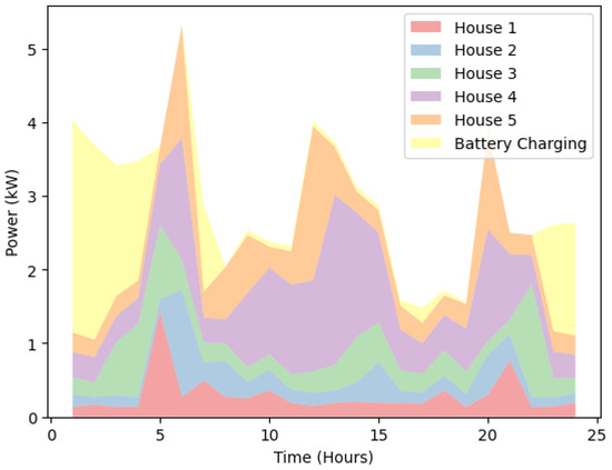 In this experiment, a week-long dataset was generated for an EC constituted of five houses, one small solar farm (15 kWp), and one small wind park (6 kWp). The characteristics of the five houses are presented in Table 1, with the following appliances: F—fridge, TV—television, WM—washing machine, VC—vacuum cleaner, PC—personal computer, CM—coffee maker, K—Kettle, BC—bread cutter, CS—cooking stove, DW—dishwasher, DM—dryer machine, WH—water heater, M—microwave, T—toaster, CP—CD player and A—amplifier.