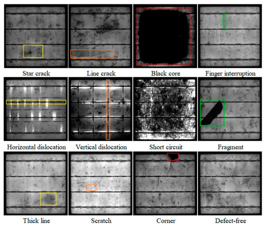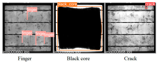 This paper uses the PVEL-AD dataset, also called the EL2021 dataset, jointly published by Hebei University of Technology and Beijing University of Aeronautics and Astronautics [29]. The PVEL-AD dataset has near-infrared images of various internal defects and heterogeneous backgrounds, including 1 type of defect-free image and 12 different types of abnormal defects, such as crack (line and star), finger interruption, black core, misalignment, thick line, scratch, fragment, corner, printing error, horizontal dislocation, vertical dislocation and short circuit defects, as shown in Figure 9. Of these, crack (line and star), finger interruption and black core are the most common defects, with other types of defects rarely occurring, which would result in an unbalanced dataset distribution if all classifications were used. In order to obtain a well-trained deep learning model using a balanced dataset distribution, EL defect images and defect-free images with a resolution of 1024 × 1024 containing the above three common defects were selected in the PVEL-AD dataset to evaluate the three proposed applications and detection results. The annotation tool (LabelImg) was used to mark the different EL defect image data sets, and the defect was closely surrounded by a rectangular box that would reflect the specific location and category of the defect. Table 1 shows the dataset configuration.