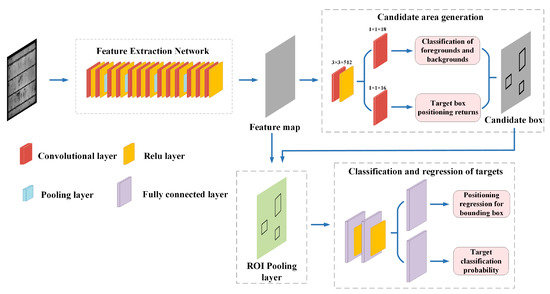 Faster R-CNN consists of three parts: feature extraction network, candidate region generation network, classification and location adjustment. The basic structure of Faster R-CNN is shown in Figure 2. First, the feature extraction network. Faster C-NN, as a CNN network target detection method, first uses a convolutional neural network (such as ResNet [20], etc.) to extract image features. This feature map is shared for subsequent RPN layers and full connection layers. Second, the regional suggestion network. The RPN network is used to generate candidate regions. This layer determines whether the anchor belongs to the foreground or background, and then uses the bounding box regression to correct the anchor to obtain the accurate prediction box. Third, region of interest pooling (ROI pooling). ROI pooling is used to convert features of the region of interest of different sizes into the same feature map output to ensure the same size of feature map after flattening. Fourth, classification. The feature map is used to calculate the categories of the prediction box, and the final accurate position of the prediction box is obtained by using the bounding box regression again.
