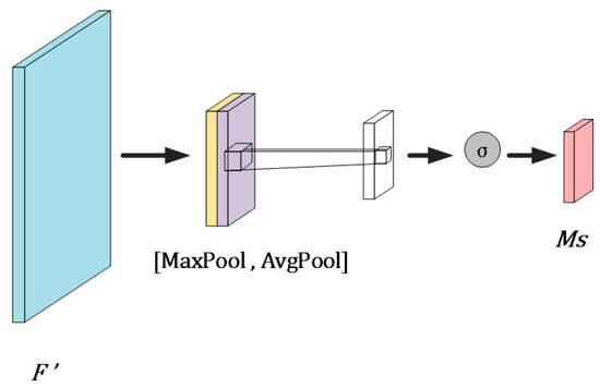 The spatial attention module is spatial-dimension invariant and compresses the channel dimension, as shown in Figure 6. This module focuses on the location information of the target. SAM takes the output of channel attention and obtains two feature maps by maximum pooling and average pooling, then splices the two feature maps by concat operation, turns them into one-channel feature maps by convolution, and then obtains the spatial attention’s feature map, and finally the output result is multiplied with the original map to change back to the size of as in Equation (6), where F denotes the input of the feature map , is the two-dimensional channel attention map, MLP is the multilayer perceptron, AvgPool( ) is the average pooling operation, MaxPool( ) is the maximum pooling operation, σ is the sigmoid activation function, is the convolution operation with a convolution kernel size of , and [;] is the splicing operation of channel dimensions.