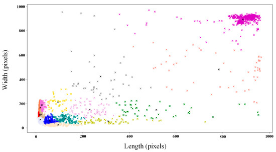 in K-means means that the clusters are clustered into k clusters, and means signifies that the mean of the data in each cluster is taken as the center of the cluster, or called the centroid; that is, the centroid of each class is used to describe the cluster. The clustering process of the K-means clustering algorithm can be regarded as the process of continuously finding the centroids of the clusters. This process starts from randomly setting k centroids until k real centroids are found. Li et al. [23] used k-means on the basis of the Faster R-CNN model to improve the cluster analysis of the eel head detection frames annotated in the training set to achieve accurate counting of circulating water farmed eels.