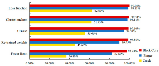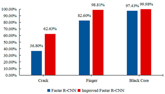 As shown in Figure 11, the AP values of various types of defects on the test set under different improvement methods can be seen, each improvement method improved the detection accuracy of each defect category, especially the detection accuracy of small defect target categories, significantly. For example, the original Faster R-CNN model had a poor detection effect on the small defect category such as cracks, which was only 36.80%. After adding the improved method in this paper, the final detection accuracy of the algorithm in this paper for this category was 62.63%, which is higher than the original model, respectively, increased by 25.83%. In contrast, for the black core with a large defect area and obvious color contrast, the original model already had high detection accuracy, and the detection accuracy of the improved model can only be slightly improved. The experimental results showed that the improved method in this paper had a certain effect on the detection of small target defects, and could effectively reduce the missed detection rate and false detection rate of defects.