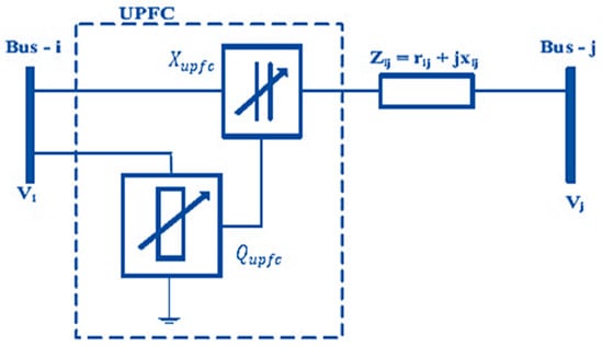 The UPFC compensation level’s range is considered as [26,27] Because 100% compensation will cause a resonance issue in the series circuit of the system, the safe limit of the reactance of the line is considered as 70% for compensation. According to the model, as it is presented, the Qupfc delivers or drains reactive power through a shunt converter at the line’s designated bus, which is where the UPFC is situated.