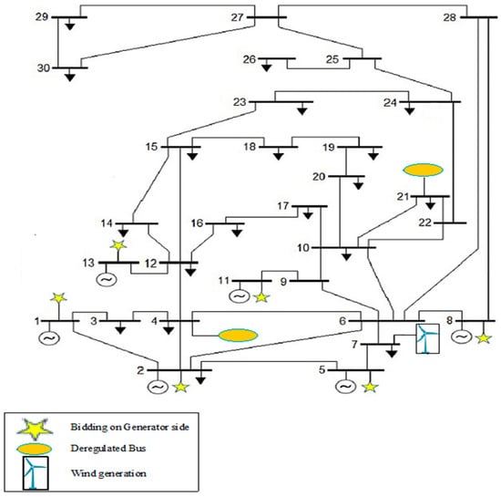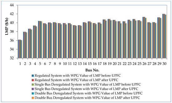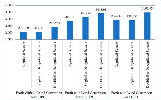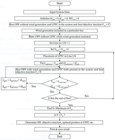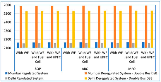 where = the total number of UPFC devices, and = the total number of linked wind generators. It has been identified that the objective function is composed of societal welfare, UPFC investment costs, and WPG installation costs. The main purpose of the proposed strategy is to reduce the objective function (F), as shown in Equation (31). To meet this need, we have enhanced the consumer benefit curve, minimized the investment cost of the UPFC, and reduced the installation cost of the WPG. As a result, societal welfare improved significantly.