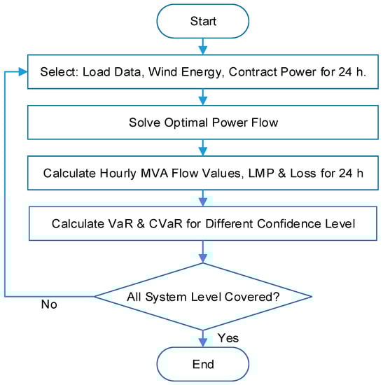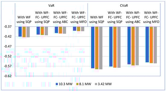 VaR and CvaR’s functions are given in Equations (29) and (30), respectively. The evident reciprocal link between system risk and VaR and CvaR indicates that the degree of system risk will either be the highest or lowest Depending on whether VaR and CvaR have the smallest or largest negative values. As a result, extending from left to right of the curve (as illustrated in Figure 2), the system risk must be decreased or the VaR and CvaR values must be raised in a positive way. One of the main goals of this endeavor is to reduce system generating costs as much as possible. The rightmost tail of the curve, when the system profit is the maximum and the system generating cost is lowest, is where the VaR and CvaR are of most benefit. As a result, there is an inverse relationship between the VaR and CvaR and the system generation cost. Contrarily, system generating costs are negatively related to social welfare; thus, it rises when generation costs are reduced and falls when they are not. VaR and CVaR thus have a direct relationship with social well-being.