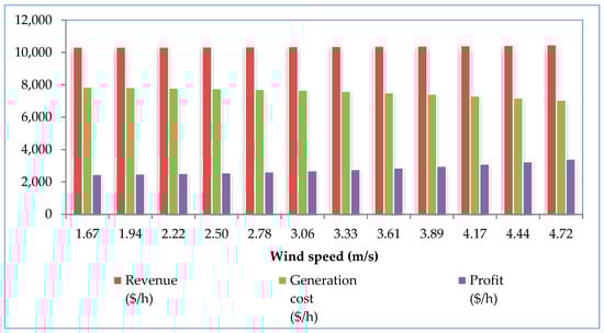 According to the wind speed data, as mentioned in Table 1, the average wind speed for all the designated sites is between 1.67 m/s and 4.72 m/s. The wind power generation costs are $3.75/MWh to invest [25]. It is anticipated that the power facility would concurrently install 50 turbines. Table 2 summarizes the speed of the wind at the necessary height, the amount of energy that can be generated from the wind, and the wind cost associated with various wind speeds.