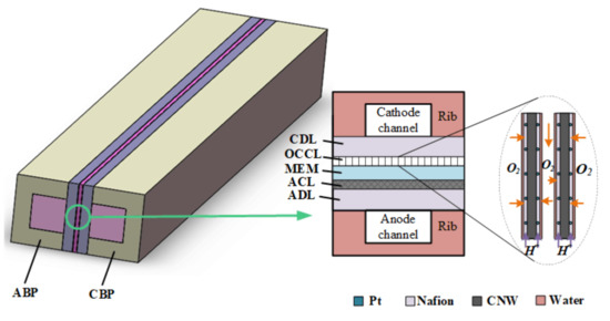 The transport of electrons in PEMFC satisfies the electron conservation equation, and the solution domains are the ACL, OCCL, GDLs, and BPs.