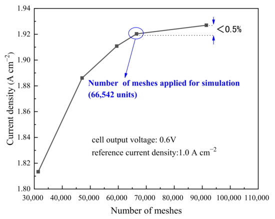In this study, the grid independence test and experimental data verification of the model are conducted to examine the accuracy of the numerical model of the ordered PEMFC. This work establishes a three-dimensional model with an ordered catalyst layer structure. In comparison to the model in literature, the impacts of water accumulation and electrolyte film thickness on oxygen transfer are taken into consideration. In addition, the influence of triple-phase content of OCCL on the performance of PEMFC and the investigation of the optimal triple-phase content are the main objectives of this work. Figure 4 compares the current density at 0.6 V for five different mesh numbers (31,412, 47,075, 59,476, 66,572, 91,460). It has been noted that the difference between the present density with a grid number of 91,460 and 66,575 is only 0.7%. At this time, it is determined that the numerical calculation results are independent of the grid, so this paper adopts a grid of 66,576 cells for battery performance analysis. Figure 5 compares the cell polarization curves simulated in this chapter with the data of Du et al. [30] at the same operating conditions. It has been observed that the corresponding current densities are roughly consistent with the reference data, and the maximum error is less than 5.5%. Therefore, the numerical model of ordered PEMFC could be applied to investigate the optimal triple-phase content of OCCL.
