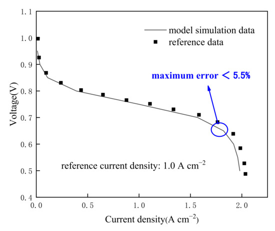 where and are stoichiometric numbers of anode and cathode; stands for reference current density; and represent contents of hydrogen and oxygen at the inlet, which could be computed by