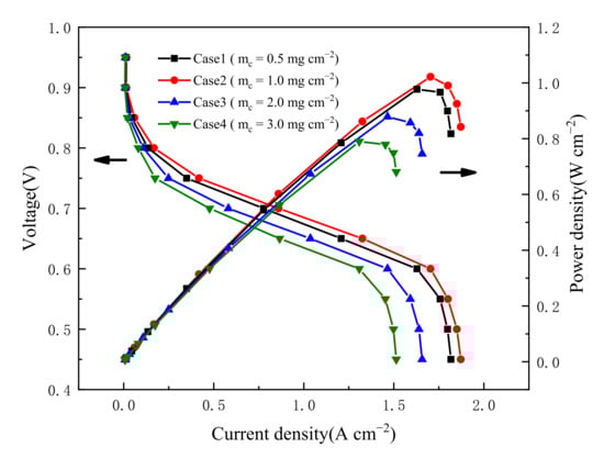 Increasing the total active reaction area of the cell is an effective measure to enhance the performance of the cell, one of which is to increase Pt loading. Therefore, finding an optimal Pt loading can thereby increase fuel-cell performance while decreasing manufacturing costs. The polarization and power density curves at five different Pt loadings, ranging from 0.06 mg cm−2 to 0.30 mg cm−2, are shown in Figure 9. The electrolyte film thickness and the carbon loading are assumed to be constants for the purposes of the simulation. It is clear that the fuel cell’s power density rises when Pt loading rises from 0.06 mg cm−2 to 0.12 mg cm−2, but with a further increase, the power density starts to drastically decline.
