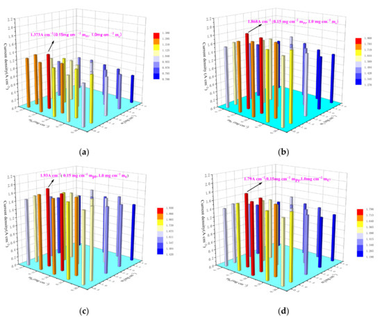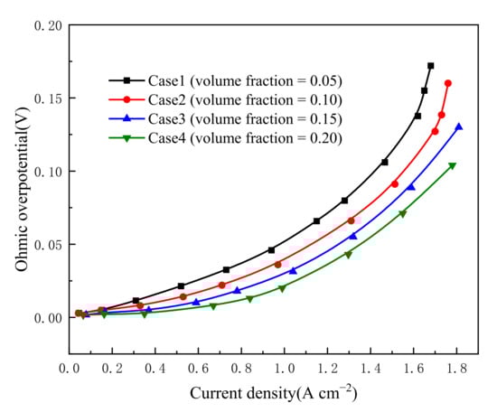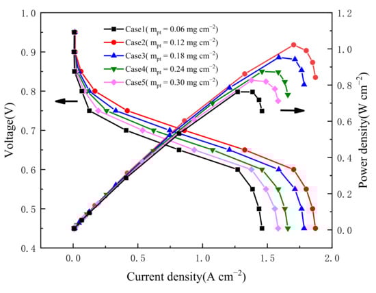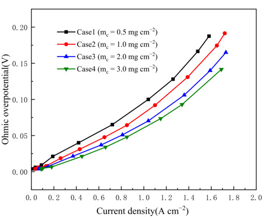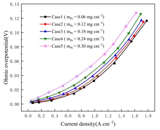 The change in ohmic loss with five Pt loadings is seen in Figure 10. It can be shown from Equation (17) that increased Pt loading causes the electrochemical surface area (ECSA) to rise. On the other hand, increased Pt loading reduces concentration and activation overpotentials. The above two points can explain why power density increases when the Pt loading increases from 0.06 mg cm−2 to 0.12 mg cm−2. However, the power density reduces with a further increase in Pt loading, which could be explained by the following two points: the continued increase in Pt loading will result in the accumulation of Pt particles and a decrease in ECSA. On the other hand, the ongoing rise in Pt loading will result in a decrease in electrolyte content, which will cause a decrease in proton conductivity and an increase in ohmic loss based on the assumption of constant electrolyte film thickness.