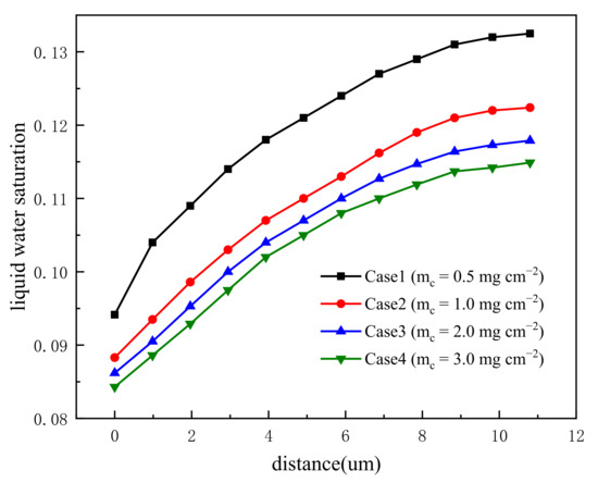 The change in ohmic loss with four carbon loadings is seen in Figure 7. The decrease in ohmic loss with increased carbon loading may account for the improvement in cell performance between carbon loadings of 0.5 mg cm−2 and 1.0 mg cm−2. The impact of carbon loading on the distribution of liquid water in OCCL is seen in Figure 8. With the increase in carbon loading, the liquid water saturation decreases, which is because of the fact that more water is discharged due to increased water-driving force. In addition, generated water is also different under different carbon loadings.