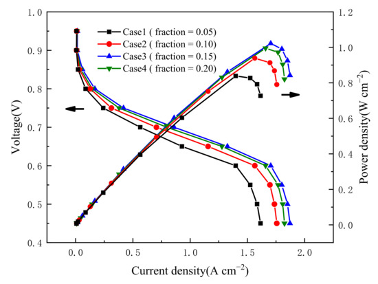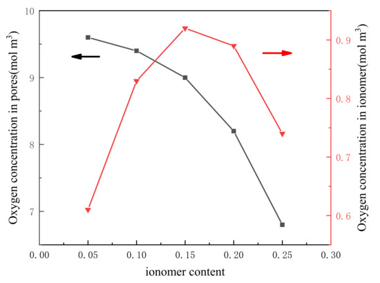 It was discovered that the ionomer loading had a significant impact on the transport of protons, membrane water, and oxygen. To increase proton conductivity, oxygen diffusivity, and membrane water diffusivity, it is crucial to select the optimal ionomer loading. As shown in Figure 11, with constant Pt loading and carbon loading, the impact of ionomer volume fraction is examined. As can be observed, the cell power density rises as the ionomer volume fraction rises from 0.05 to 0.15, but it declines as the volume fraction rises higher. When the thickness of the ionomer film is too thin to cover the Pt particles (with a volume fraction of 0.05), the utilization of Pt particles is lowered, which greatly affects the fuel-cell performance. Thickening ionomer film reasonably (the volume fraction increases from 0.05 to 0.15) is beneficial to proton conduction, giving rise to a low ohmic loss. At the same time, increased ionomers greatly reduce the resistance to proton and water transport. However, with a further increase in ionomer film thickness (the volume fraction increases from 0.15 to 0.20), oxygen transport resistance increases, and the porosity of OCCL is considerably diminished, resulting in impeding the delivery of reactive gases in OCCL.