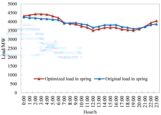 First, the price elasticity coefficient of industrial users’ electricity demand in spring was calculated, as shown in Table A1. Then, the TOU tariff and load optimization results in spring were calculated, as shown in Table 4 and Figure 3.