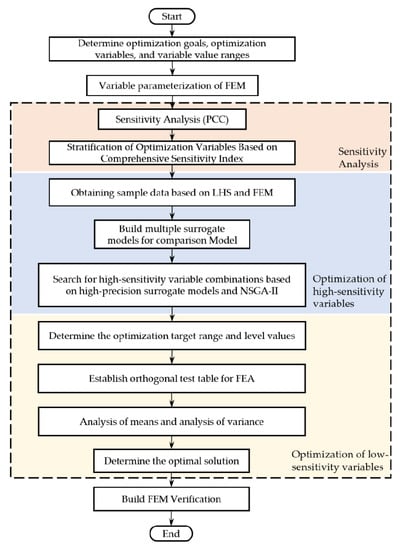- Obtaining sample datasets by using LHS and FEM for high-sensitivity optimization variables and then constructing a high-precision surrogate model based on the sample datasets.