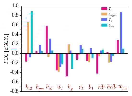 The sensitivity of each optimization variable to the optimization objective is calculated according to Equation (6), and the results are shown in Figure 3. Each optimization variable is different for the PCC of the different optimization objectives. For instance, the optimization variables with a significant impact on Tr are bs0, wt, hg, rib, and wpm. The optimization variables with an enormous impact on pCu are hs2 and wt. The optimization variables with a significant impact on Ta are bs0, wt, and wpm. The optimization variables with an enormous impact on pfe are hs2, wt, and hg. Based on the above analysis, the optimization variables that have a significant effect on each optimization objective are not identical, and it is impossible to select the key optimization variables. Therefore, it is necessary to study the sensitivity of each optimization variable as follows: