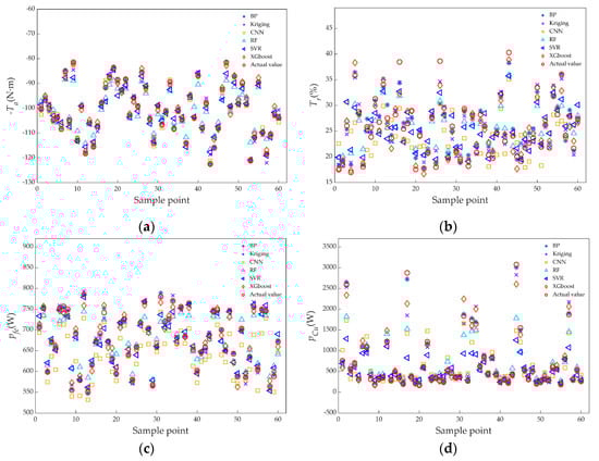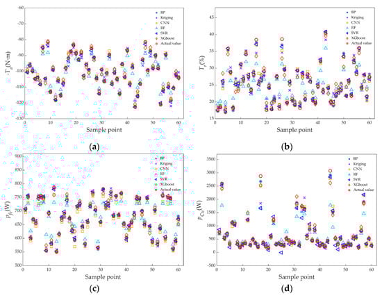 where n is the number of samples in the test set, yi is the actual values of the samples of the test set, ŷi is the predicted values of the samples of the test set, and is the average value of the actual values of the samples of the test set. The test results of each surrogate model are shown in Figure 4 and Figure 5, and the specific evaluation indicators are shown in Table 4.