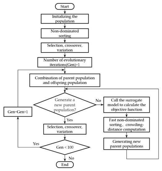When combined with the high-precision surrogate model established above, the optimal combination of design parameters is searched by using a multi-objective optimization algorithm. NSGA-II is widely used in multi-objective optimization problems due to its fast speed and strong searchability. Therefore, in this paper, the optimal combination of design parameters of the IPMSM is searched by NSGA-II. The specific implementation steps are shown in Figure 6.