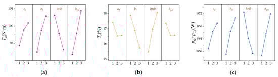 Impact of level values of optimization variables on optimization objectives: (a) impact of variable level on Ta; (b) impact of variable level on Tr; (c) impact of variable level on pfe + pCu.