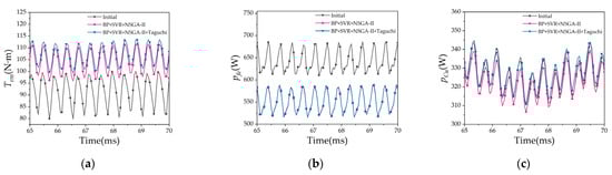 In order to verify the effectiveness of the above optimization methods, the performance of the variable-optimized motor was analyzed by finite element analysis (FEA) and compared to that of the optimized motor. Figure 9a shows the electromagnetic (EM) torque of the initial IPMSM and the optimized ones in the time domain. Figure 9b shows the iron losses of the initial IPMSM and the optimized ones. Figure 9c shows the copper losses of the initial IPMSM and the optimized ones. More detailed performance parameters of the initially designed motor and optimally designed ones with different methods are shown in Table 10.