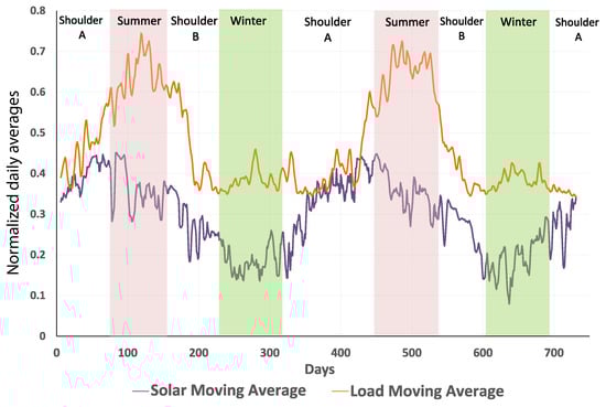 Rather than relying on a calendar-based approach to classify seasons, seasonal breakdowns are identified based on the available historical data. This enables us to capture spatial determinants of seasonal variations, such as geographic insolation and local weather patterns as well as geographic load patterns (e.g., heavy loads in winter for the colder climates and heavy loads in summer for the hotter climates). Moving daily averages of load and solar generation are plotted first, and the plot is then partitioned based on the pattern transition in both load and solar generation. Figure 1 depicts the resultant partitioning for the available historical data. The non-summer/non-winter days are classified as shoulder days. The characteristics of each season are captured in Table 1. Note that Shoulder A and Shoulder B are combined for training the GAN as they represent very similar (average) characteristics despite different slope polarities.