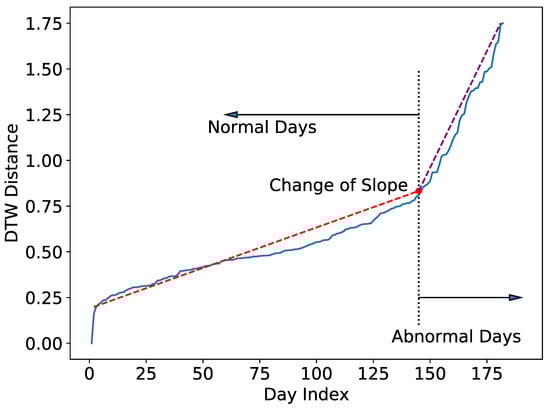 For n days in a given seasonal dataset, DTW creates a symmetrical matrix that has the DTW distances between each pair of days. Next, the distance of each day in a season to its reference normal day is computed, and the sorted distances are plotted. The slope change can be detected by taking the second derivative of the DTW distance plots. The data points beyond this change point represent the abnormal days as they have farther and faster-growing distances from the reference normal day. This is illustrated in Figure 2. Applying the criterion outlined above, the summer season is split into 143 normal days and 39 abnormal days (from 2 years of data). A similar classification was obtained for the winter (146 normal and 36 abnormal days) and shoulder (327 normal and 40 abnormal days) seasons.
