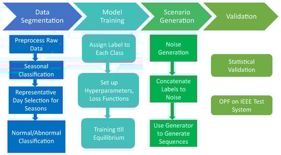 The proposed approach of systematic model-free data segmentation and scenario generation using implicit generative models has been summarized in Figure 4. First, the historical data is preprocessed by normalizing the different variables to their peak values and creating daily profiles. Next, the data is segmented in preparation for GAN training. The available data is classified by season, and a representative day is selected for each season. Finally, the normal/abnormal classification is performed for each season, leading to the generation of six datasets (three seasons and normal/abnormal for each season). The next phase involves training the generator and discriminator using the labeled correlated datasets. The hyperparameters are tuned, and the loss functions are monitored to achieve an equilibrium that indicates a fully trained GAN model. In the next phase, the GAN model is fed labeled noise to generate similar but distinct scenarios for each of the six datasets. Finally, statistical validation of the generated scenarios is performed before moving onto OPF-based validation concerning the historical data and against the existing methodology of uncorrelated scenario generation.
