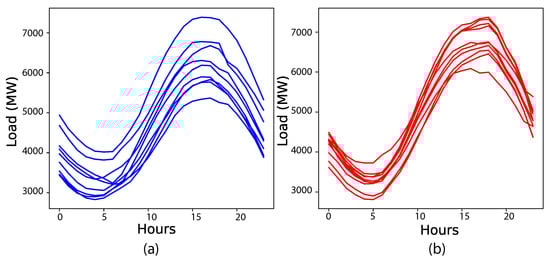 Selected summer season normal load profiles: (a) real; (b) generated.