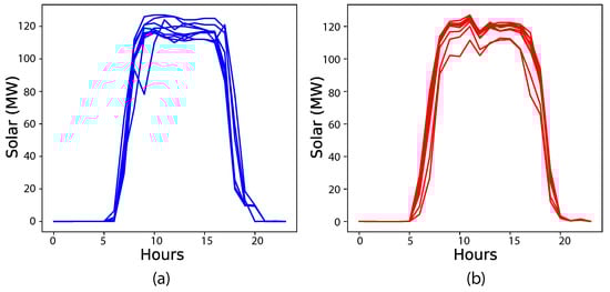 To highlight the value of the correlated scenario generation process, two additional GANs were trained using the same historical data—one for the independent generation of load sequences and one for the independent generation of solar sequences. These univariate uncorrelated GANs (termed load GAN and solar GAN) generate seasonal (normal/abnormal) scenarios for load and solar generation, respectively. Note that many GAN-based scenario generation techniques proposed recently are univariate and hence, uncorrelated (e.g., [,]). Therefore, the subsequent analysis is a comparison of the proposed methodology with the state of the art.