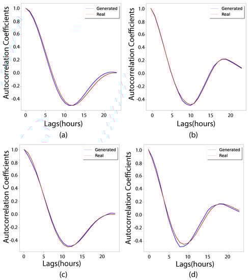 Under normal conditions, the ACF shapes of the real and generated datasets for both load and solar were found to be very similar (see Figure 7a,b). The highest positive correlation at one hour for both variables confirms that the nearest temporal value has the highest correlation to any data point. However, since the normal solar peak and zero production times in summer are roughly 10 h each, the highest negative correlation occurs at a 10-h lag for the solar profile. The normal summer load pattern shown in Figure 5 is quasi-sinusoidal with peak and valley 12 h apart, which is consistent with the negative ACF peak for the load at a 12-h lag. A similar pattern is observed for normal days in other seasons with slight variations in negative ACF peak location.