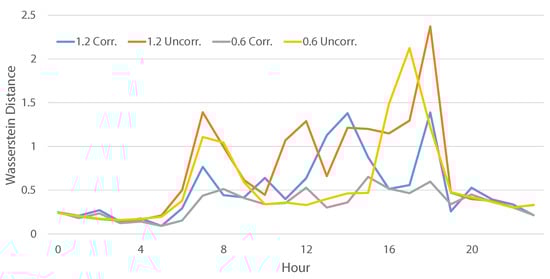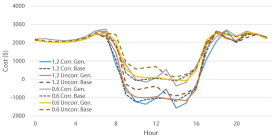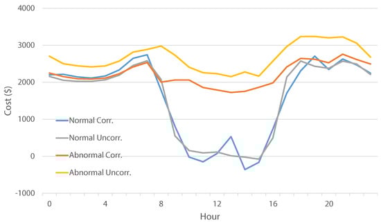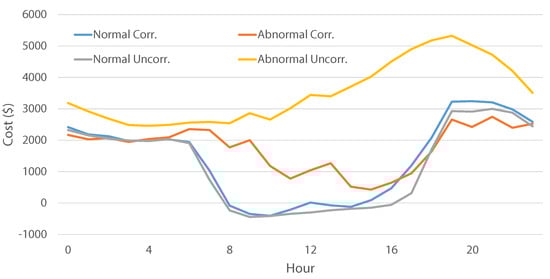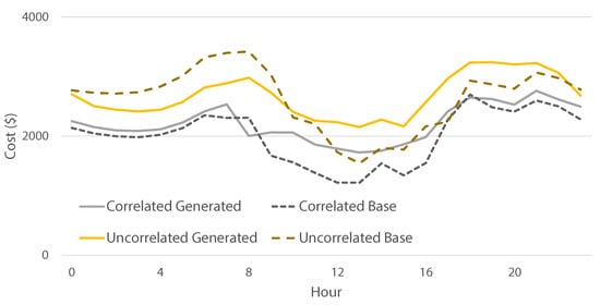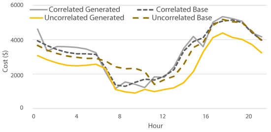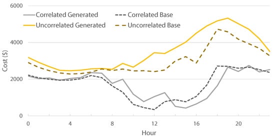 A similar case is presented in Figure 9 for the summer abnormal situation, where the correlated scenario’s costs are tracking the baseline costs well (similar to the shoulder abnormal). The baselines for correlated and uncorrelated cases are more closely aligned compared to the shoulder abnormal (except for a few morning hours), but the uncorrelated generated scenarios are underestimating the cost by a large margin. Although not shown in the figures to ensure clarity, the behavior for the other solar-to-load ratio was consistent with these results.