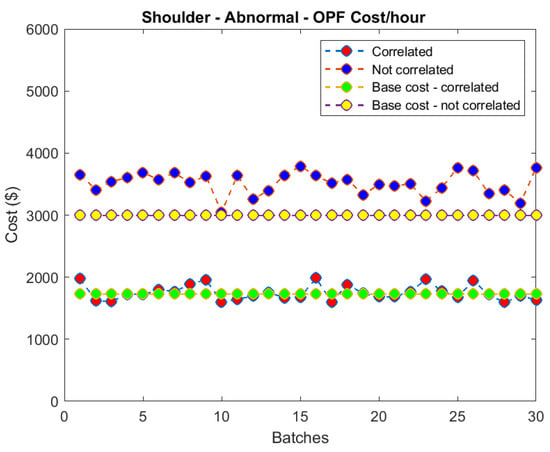 Figure 8 shows the shoulder season hourly OPF costs, averaged over 30 OPF iterations, for the solar-to-load ratio of 0.6. The correlated generated scenarios track their baseline much more closely than the uncorrelated scenarios. In addition, the baselines for the two cases show significant differences. The abnormal conditions typically signify lower solar generation (due to cloudy or rainy conditions), which is often accompanied by a lighter load (due to lower cooling requirements). However, the baseline of the uncorrelated case shows significantly higher OPF costs that result from the unrealistic combination of independently derived abnormal conditions (high load and no to low solar generation). The generated scenarios overestimate the costs (i.e., a combination of higher load and lower solar generation), resulting in grossly unrealistic scenarios.
