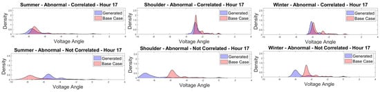 Another perspective to view the differences between the correlated and uncorrelated approaches is to look at the voltage angle distributions for the 30-bus system. Figure 12 shows the probability density functions (PDFs) of the voltage angles for 5 PM for correlated and uncorrelated scenarios for all three seasons. The better overlap with the baseline distribution is clearly visible for the correlated scenarios. These plots are for one of the 30 iterations, but a similar pattern was observed for other hours and for all iterations, albeit with some variability. The larger difference between the correlated and uncorrelated scenarios in the shoulder season may be partially attributable to the data segmentation technique used in Section 2.2. However, the distinction between the two scenario generation methods is still evident in the other seasons.