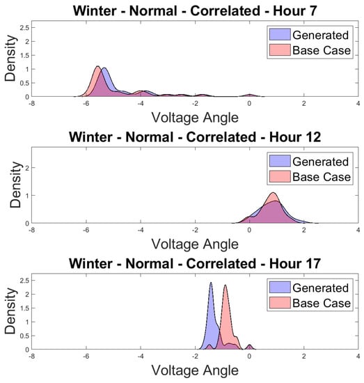 The difference between correlated and uncorrelated scenarios is not as significant under normal conditions. In fact, the uncorrelated scenarios showed a closer correlation to the baseline data in the summer season than the correlated scenarios, as shown in Table 4. This is understandable as the solar and load profiles for each season do not have many deviations under normal conditions, and the single variable nature of uncorrelated scenarios allows the corresponding GAN to be trained better for normal, independent signals. However, it was observed that for winter (see Figure 13), the uncorrelated scenarios are farther from their baselines (depicting lower costs) due to the overestimation of the solar generation. The Wasserstein distances for shoulder normal shown in Figure 14 indicate that the uncorrelated distances are higher than correlated ones for most hours of the day. The voltage-angle plots for three different hours for winter normal correlated scenarios (see Figure 15) demonstrate that the distributions are matching the baseline very well.