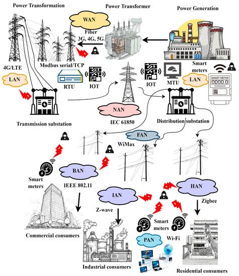 - Ahmed, S.; Gondal, T.M.; Adil, M.; Malik, S.A.; Qureshi, R. A Survey on Communication Technologies in Smart Grid. In Proceedings of the 2019 IEEE PES GTD Grand International Conference and Exposition Asia (GTD Asia), Bangkok, Thailand, 19–23 March 2019; pp. 7–12. [Google Scholar]