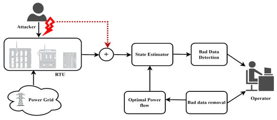 The SE method’s central concept is the estimation of each area’s state using measurements specific to that area and the sharing of boundary bus states between adjacent areas. In energy management systems, SE algorithms play a crucial role in the processing of inaccurate measurements. When bad data are present, it is anticipated that large residual errors will inevitably result from the bad data, hence bad data detection (BDD) filters measurement inaccuracies brought on by malicious assaults or device flaws. However, when a successful FDIA is started, the residual error would remain the same as usual. To safeguard state estimates, certain strategies for faulty measurement detection have been developed [14].