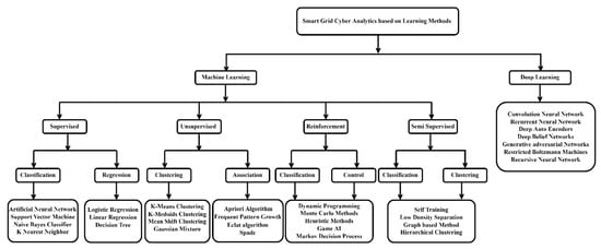 Artificial Intelligence (AI) category consists of various ML and DL, DM, evolutionary, and fuzzy logic methods to detect FDIA. Techniques to detect cyber-attacks that target smart grids can be mainly classified into four categories ML: supervised, unsupervised, semi-supervised, and reinforcement algorithms. The various cyber-attack detecting algorithms in the smart grid as shown in Figure 5.